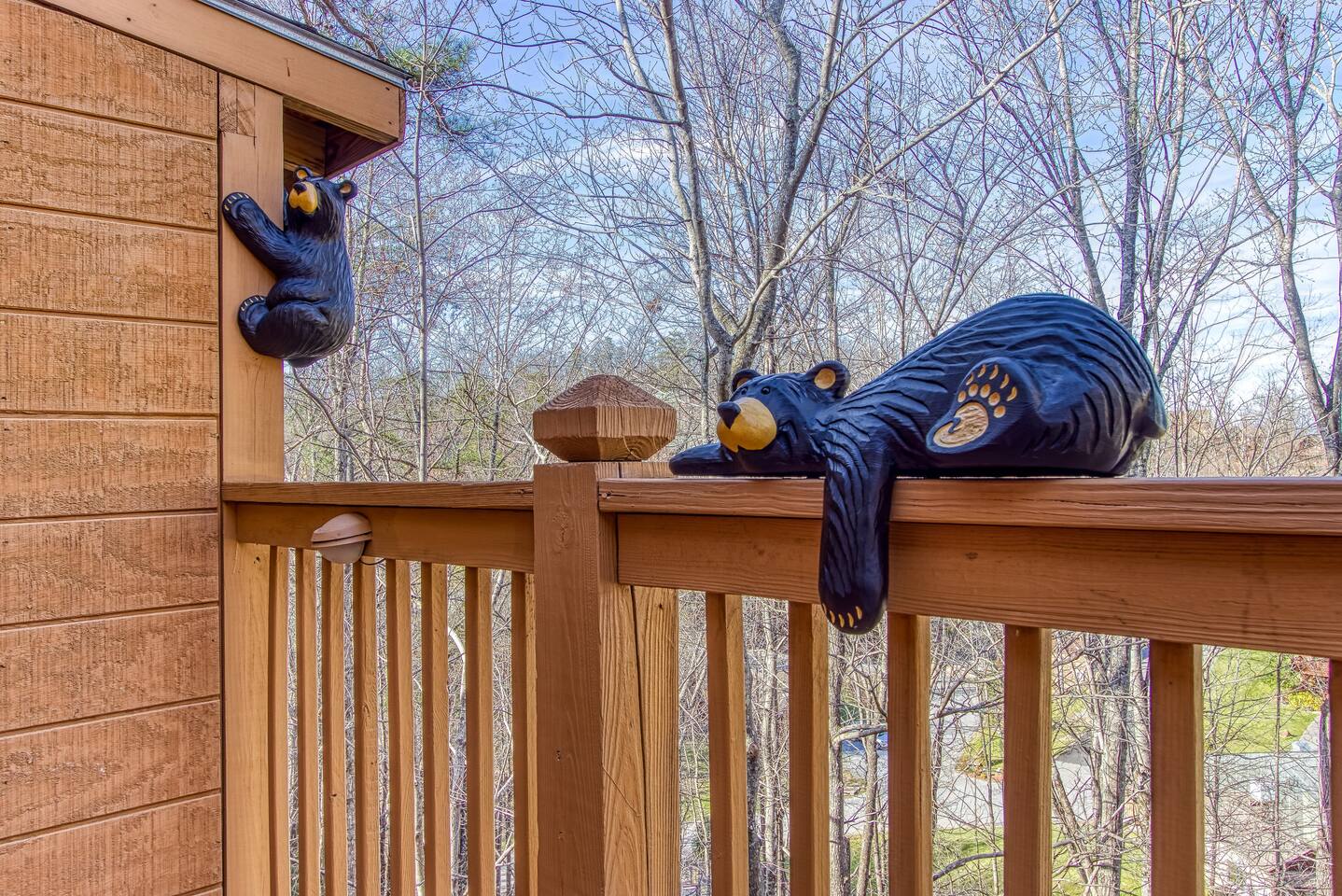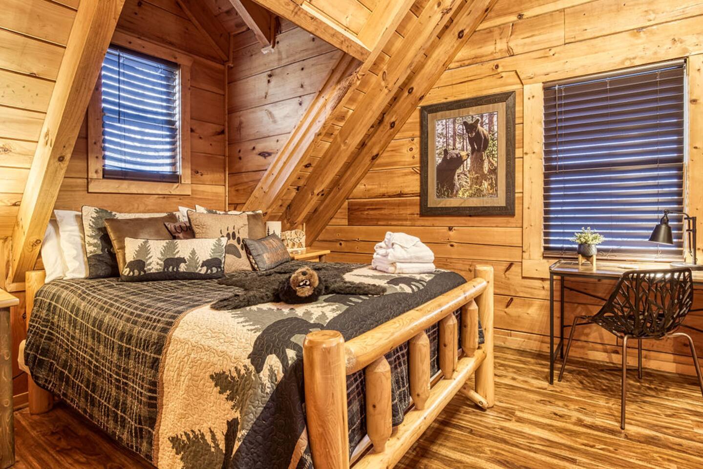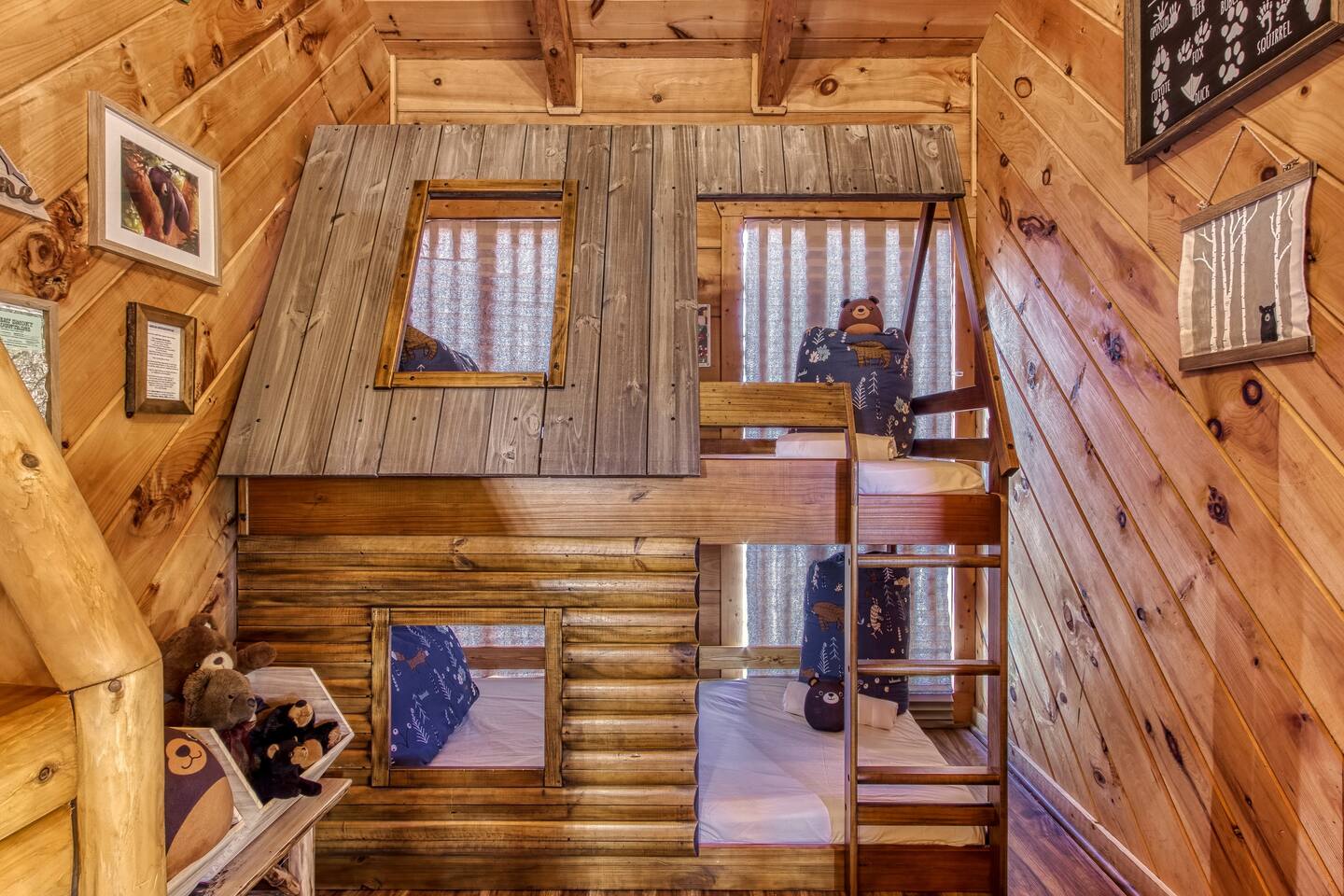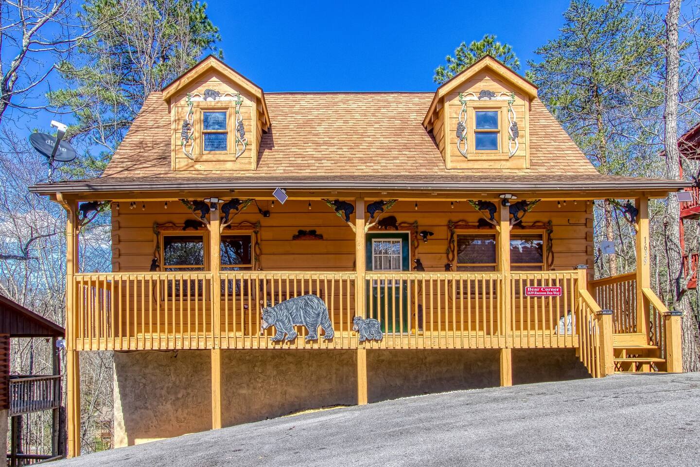 Lovely gated community in a secluded area close to nature, yet close to all the action! Gorgeously decorated, charming cabin with: - a master suite w/jetted tub - a kids' loft with bunk bed, arcade, toys - a hot tub on outside deck - an indoor (heated!) community pool Bear Corner is a true log cabin with black bear-themed decor. Truly cozy and homey; the perfect place to return to and relax after a day of fun activities in the area. Even Goldilocks would consider Bear Corner "just right"!