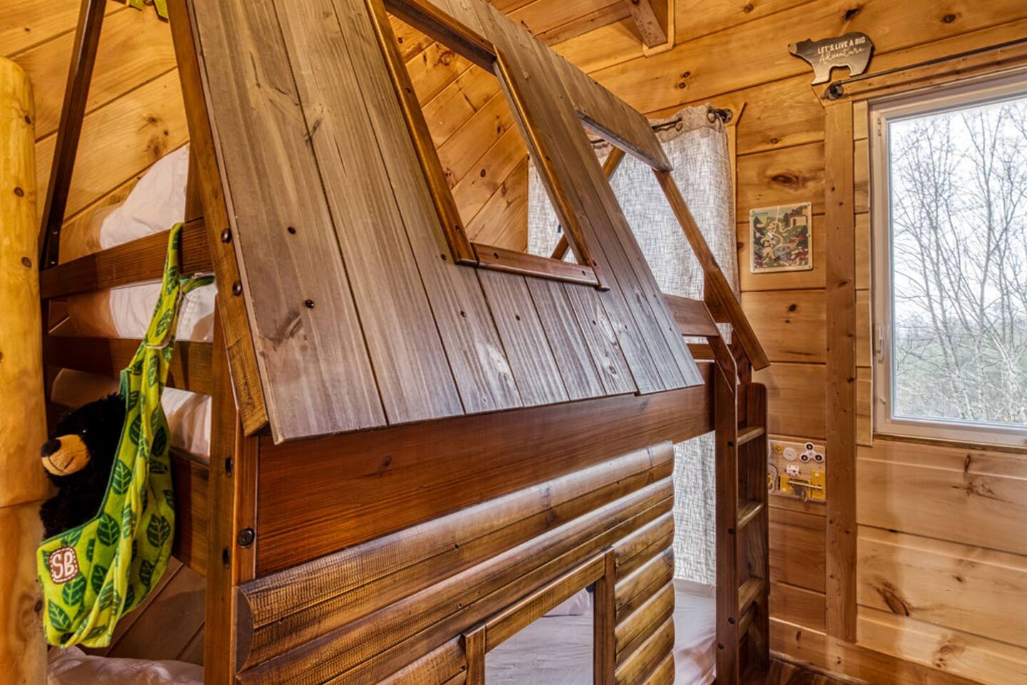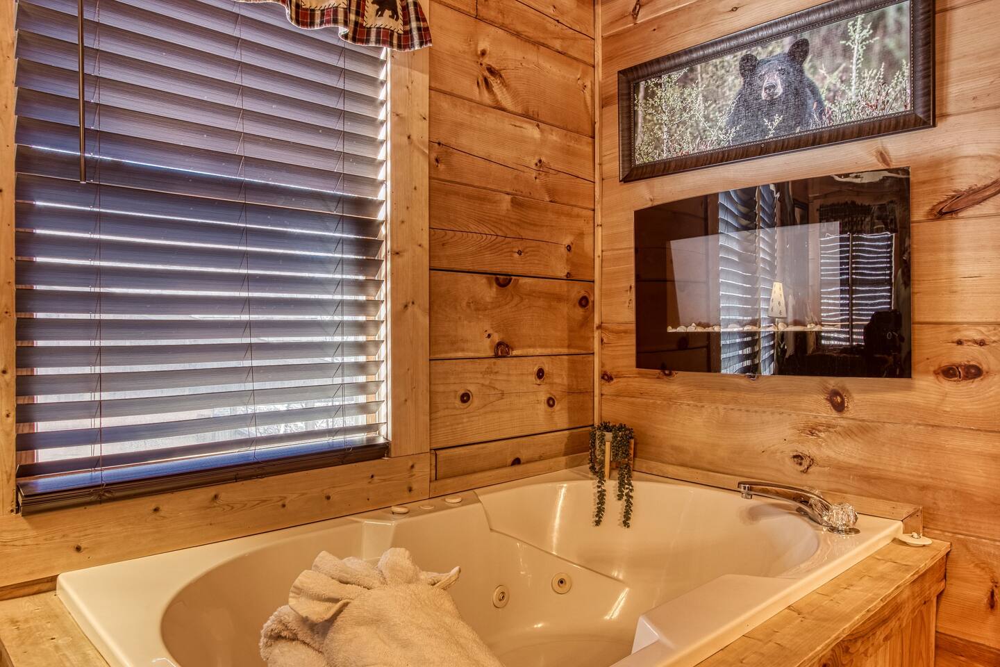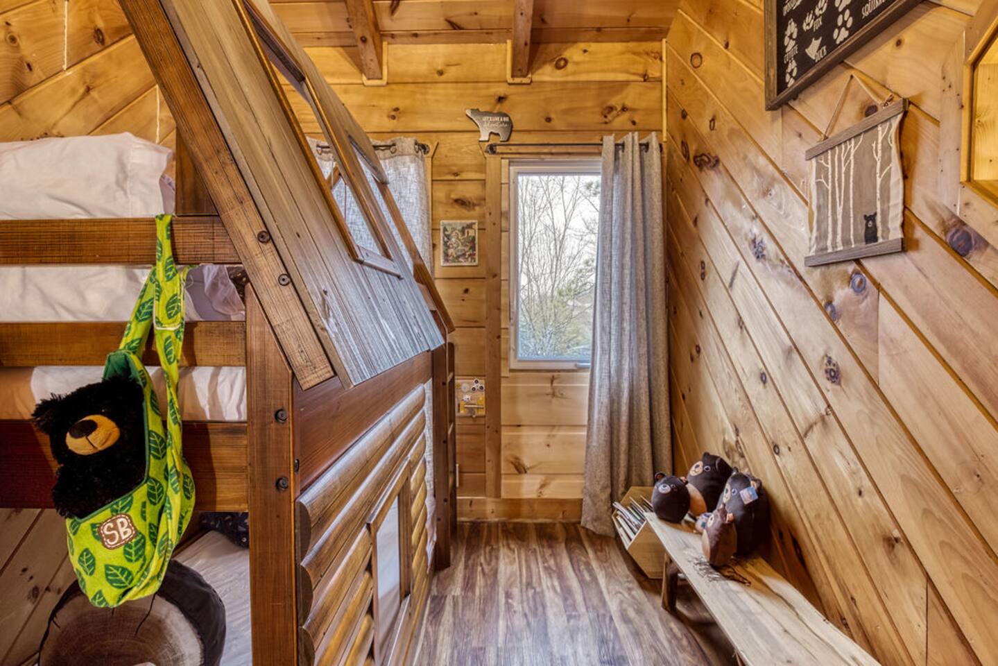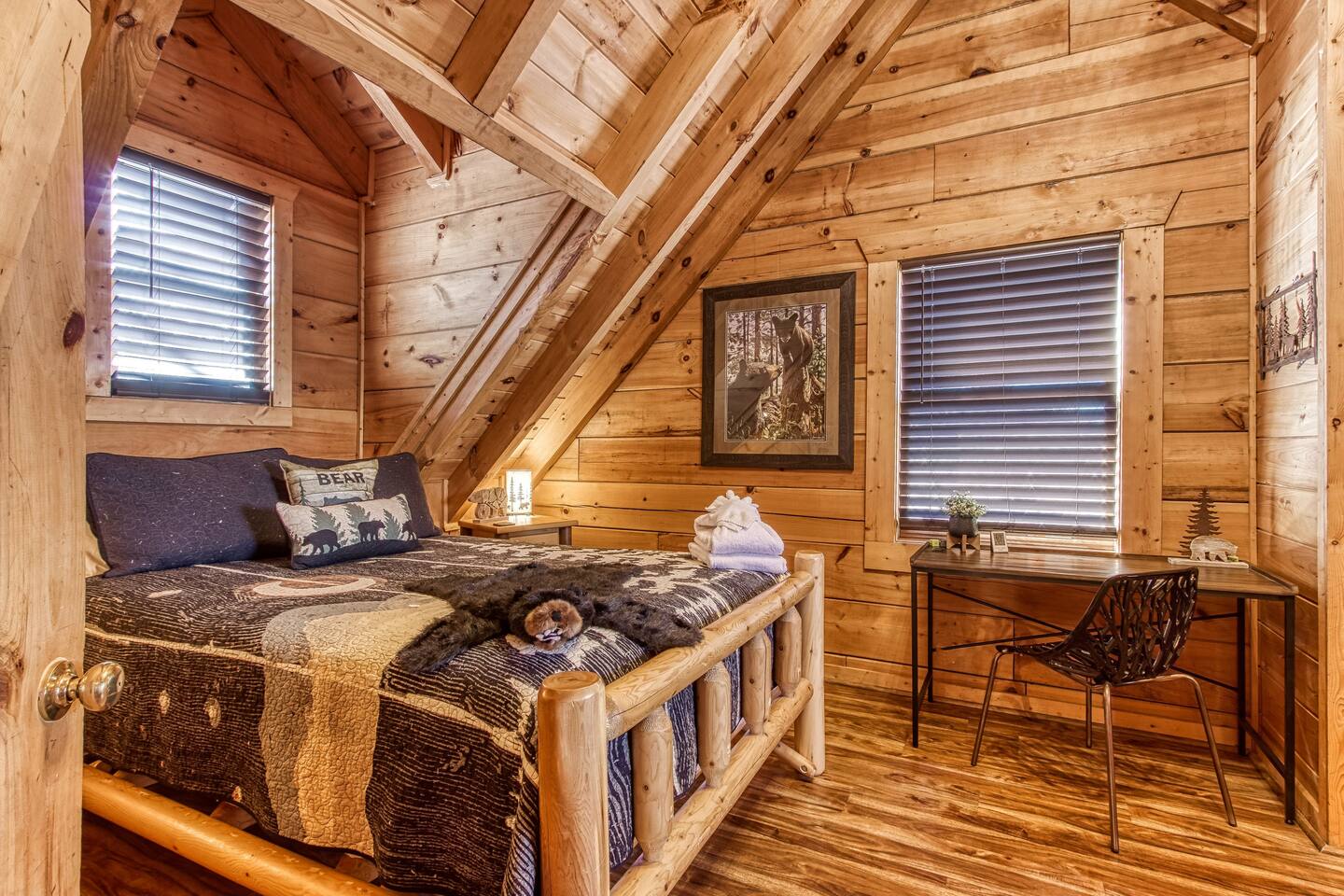 Lovely gated community in a secluded area close to nature, yet close to all the action! Gorgeously decorated, charming cabin with: - a master suite w/jetted tub - a kids' loft with bunk bed, arcade, toys - a hot tub on outside deck - an indoor (heated!) community pool Bear Corner is a true log cabin with black bear-themed decor. Truly cozy and homey; the perfect place to return to and relax after a day of fun activities in the area. Even Goldilocks would consider Bear Corner "just right"!