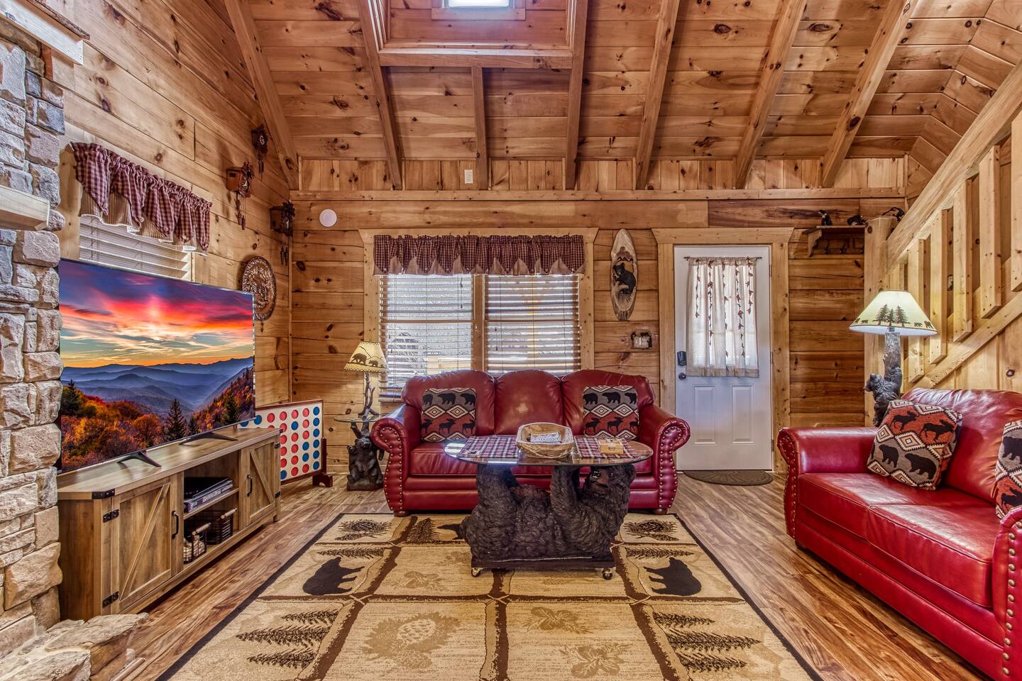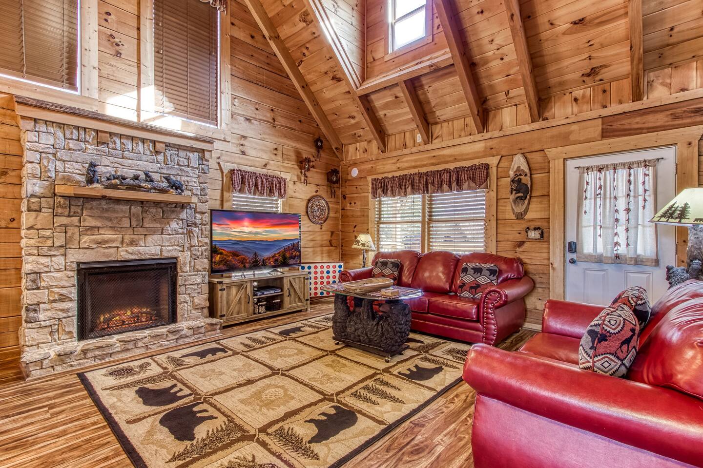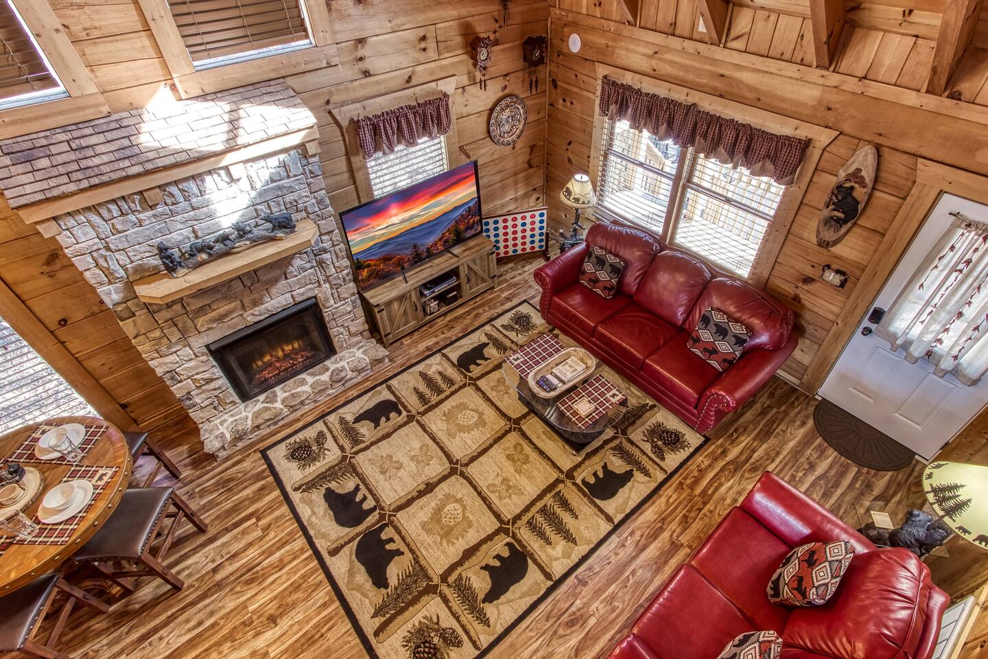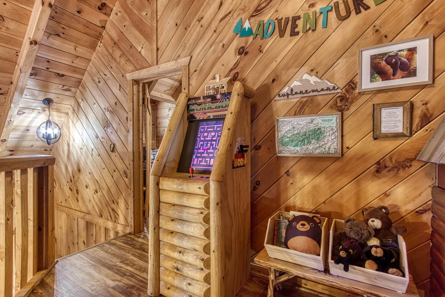 As you enter the cabin from the front porch, you'll enter the main living space with vaulted ceilings. The master suite is on the main level. Another bedroom suite is upstairs off the loft. There is an upstairs loft with a bunk bed (it looks like a "log cabin!") as well as an arcade to enjoy. The deck is just off the dining area on the main level. The hot tub is at one end of the deck in a private alcove, and the deck is surrounded by trees for shade and privacy.