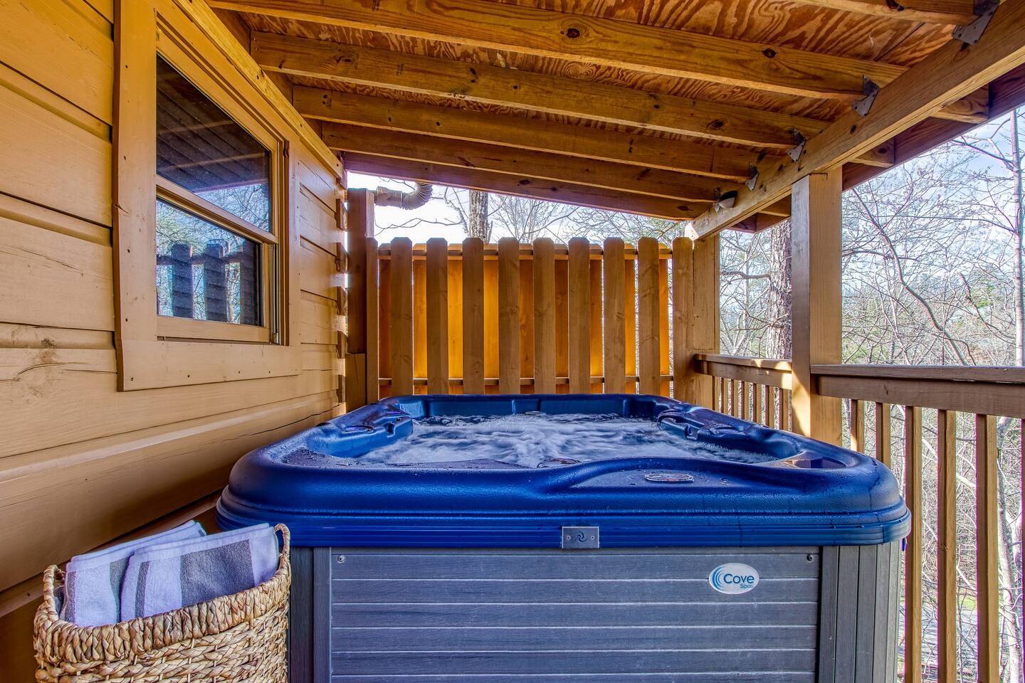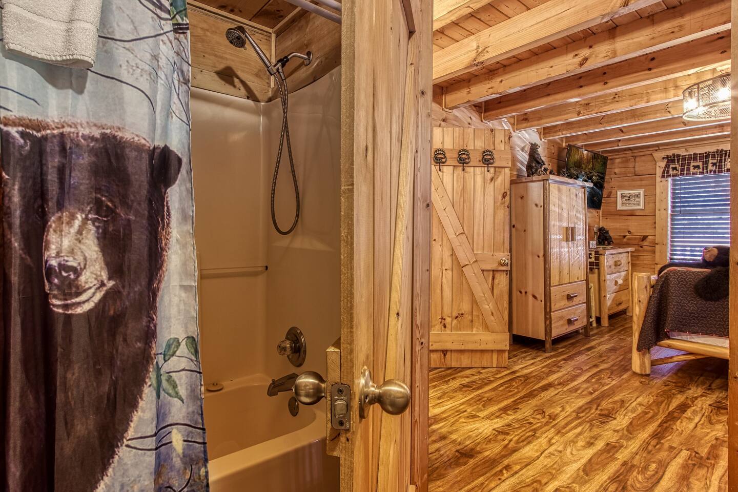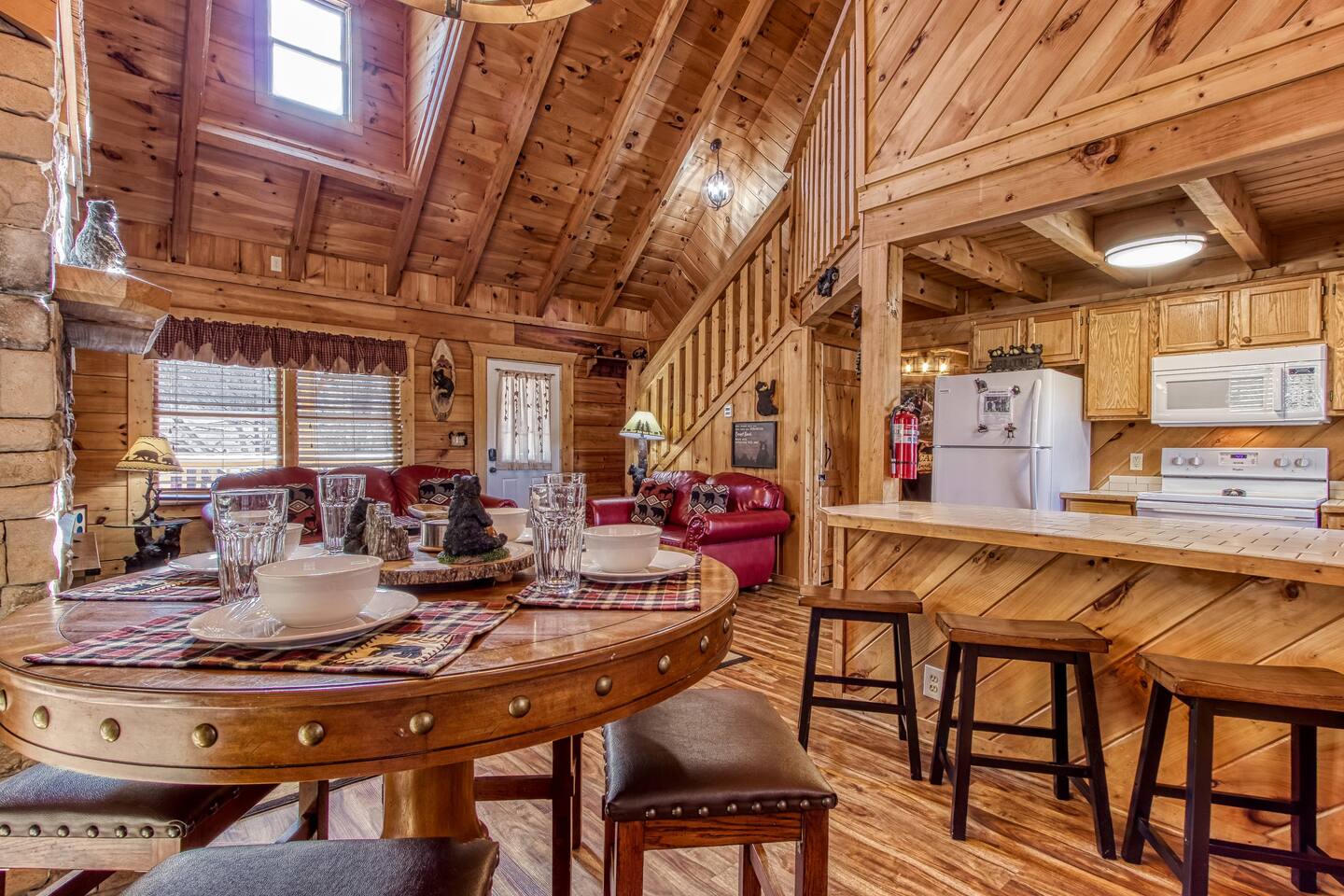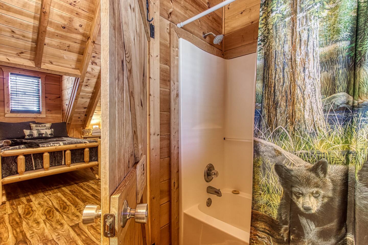 As you enter the cabin from the front porch, you'll enter the main living space with vaulted ceilings. The master suite is on the main level. Another bedroom suite is upstairs off the loft. There is an upstairs loft with a bunk bed (it looks like a "log cabin!") as well as an arcade to enjoy. The deck is just off the dining area on the main level. The hot tub is at one end of the deck in a private alcove, and the deck is surrounded by trees for shade and privacy.
