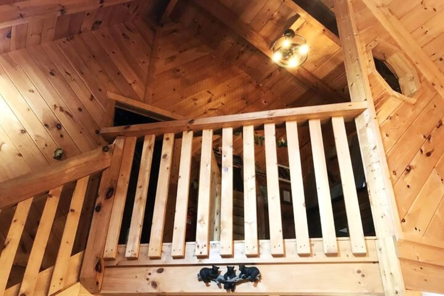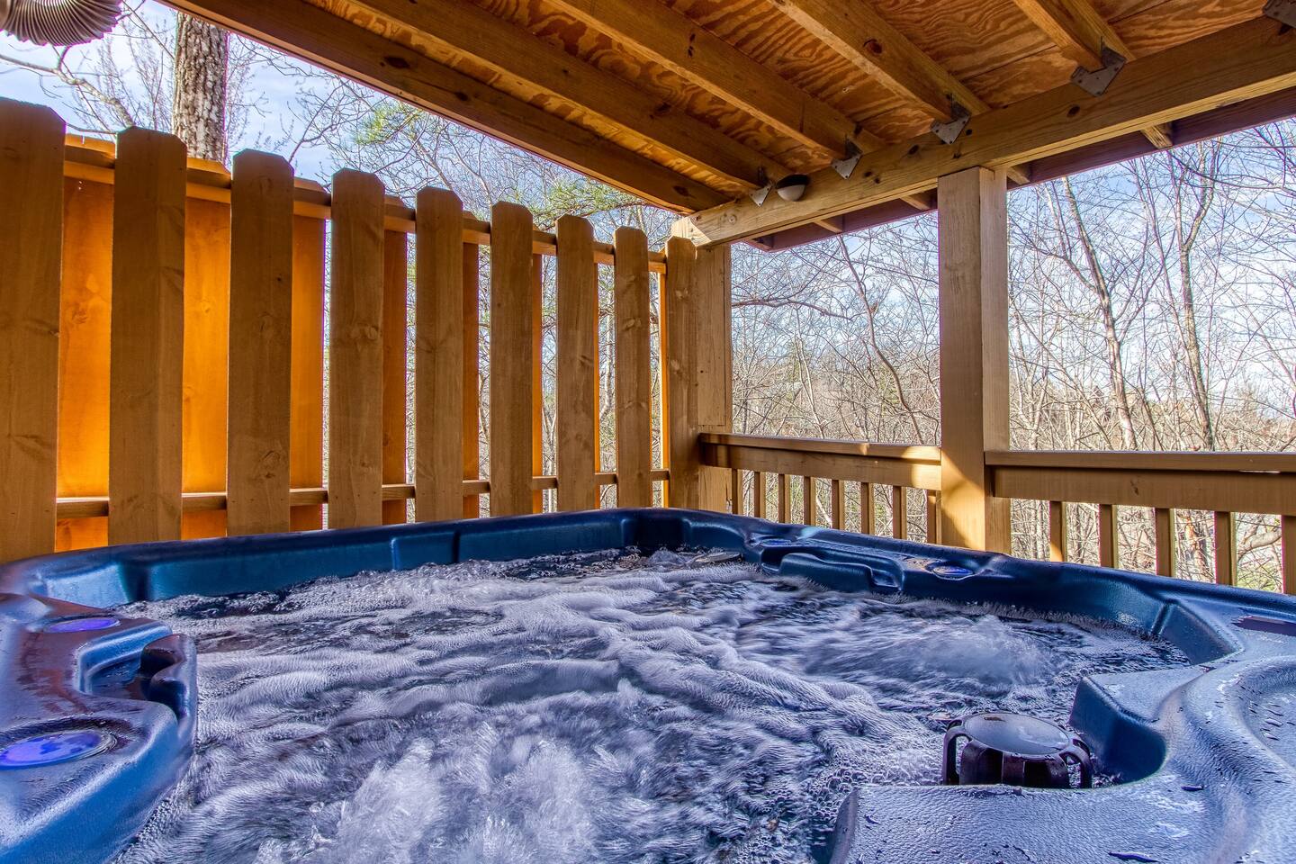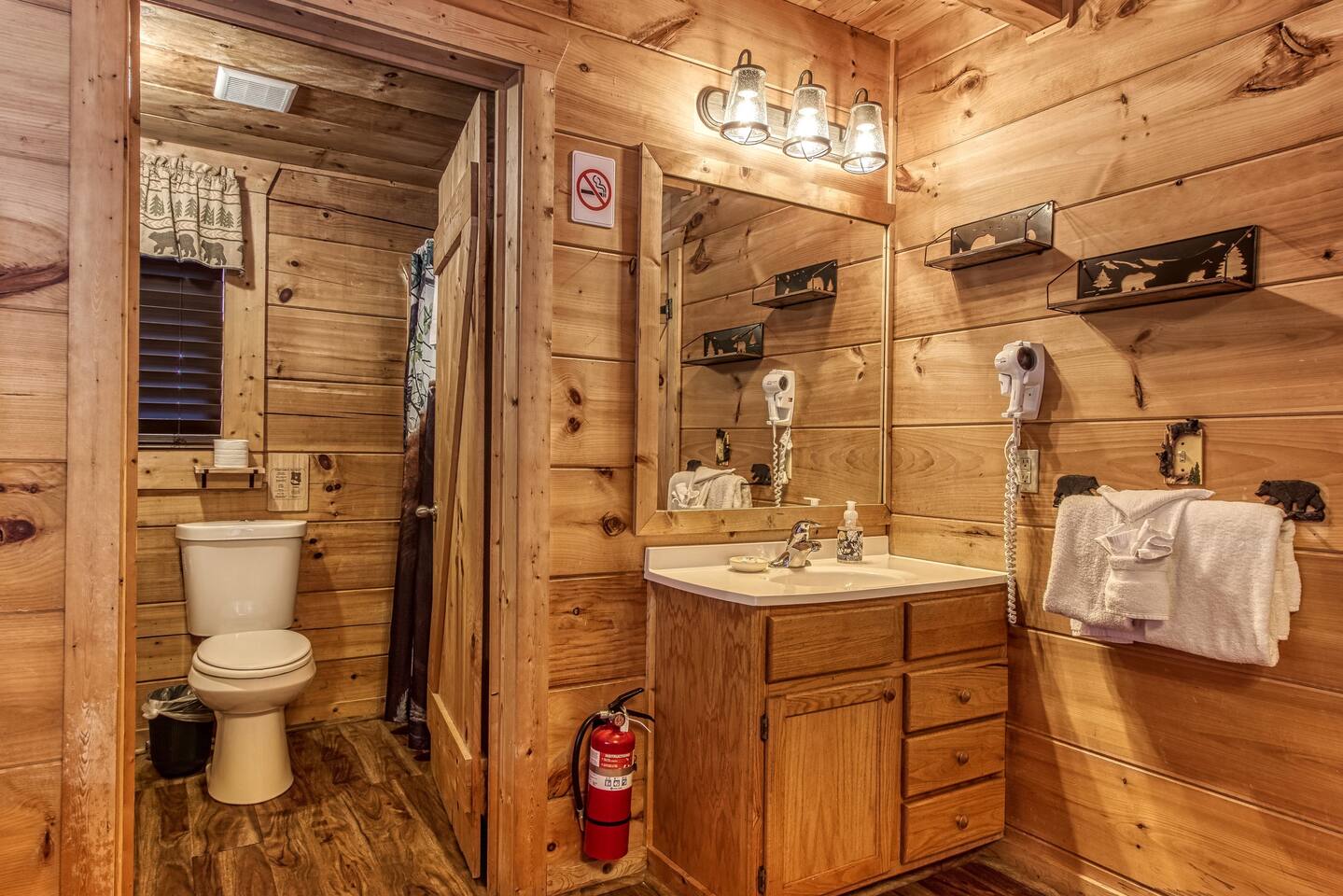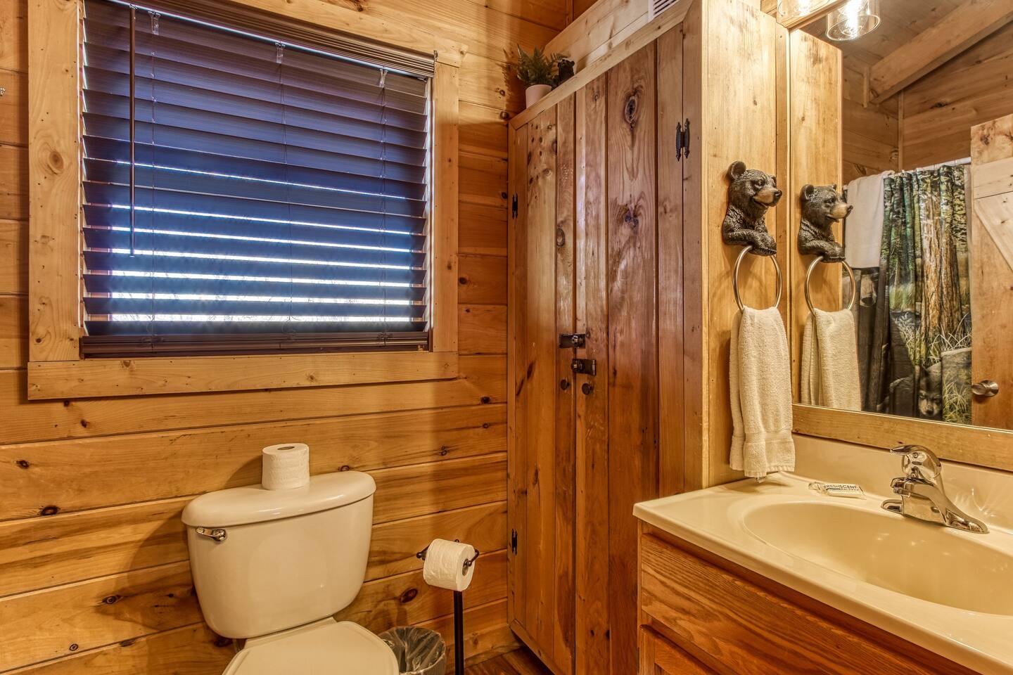 As you enter the cabin from the front porch, you'll enter the main living space with vaulted ceilings. The master suite is on the main level. Another bedroom suite is upstairs off the loft. There is an upstairs loft with a bunk bed (it looks like a "log cabin!") as well as an arcade to enjoy. The deck is just off the dining area on the main level. The hot tub is at one end of the deck in a private alcove, and the deck is surrounded by trees for shade and privacy.